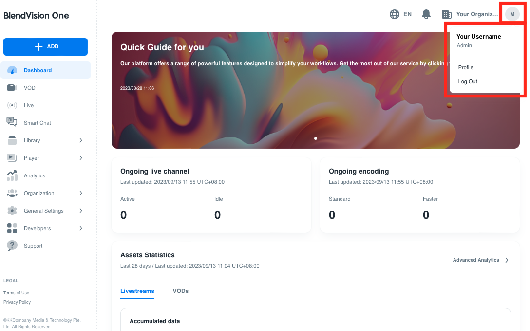 - Access and Manage the following modules: Dashboard, VOD, Live, Library, Player, Analytics, General Setting