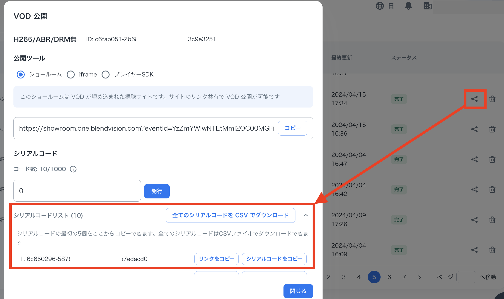 シリアルコードが発行された後に公開ツールアイコンを開くと「VOD公開」画面下部にシリアルコードが反映され、コピーが可能になります。