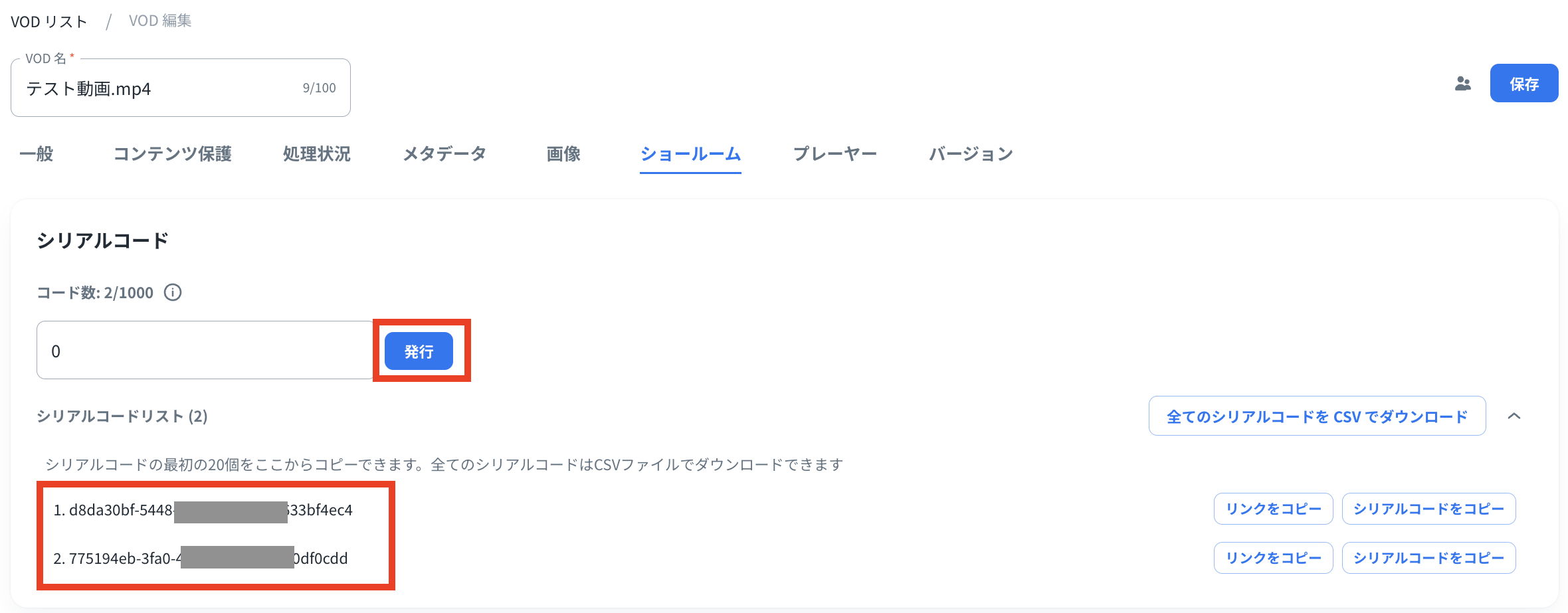 作成時に「トークン」が選択された場合「ショールーム」タブでシリアルコードが発行できます。