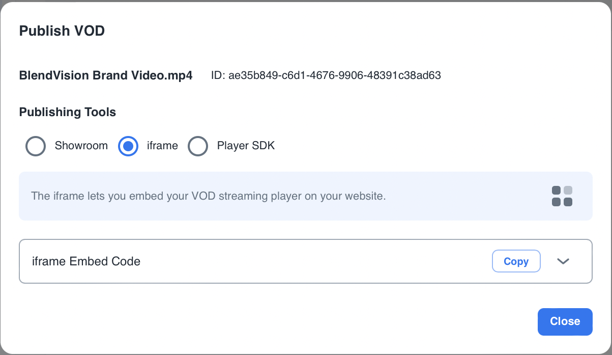 BlendVision Oneでは、コンテンツ保護機能付きでウェブサイトに埋め込みができるiframeプレーヤーを提供しています。