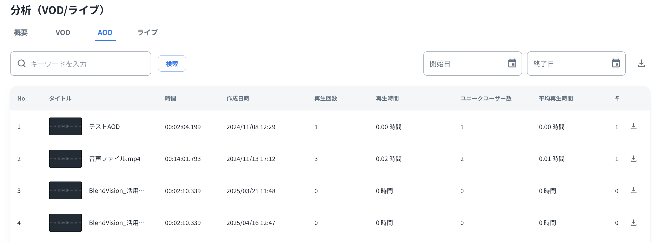 「開始日」と「終了日」に日付を指定すると、当該期間における再生情報がリストに表示されます。