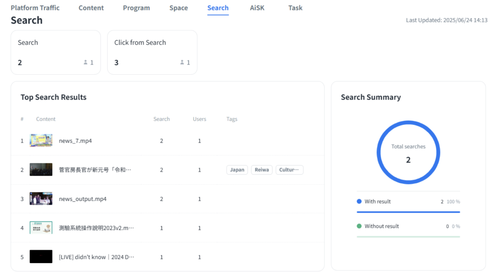 • Click from Search: Hover to confirm the click count and amount of users who clicked search results