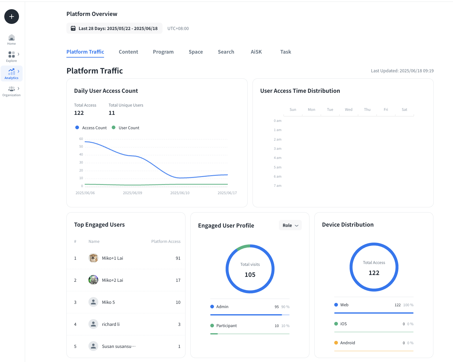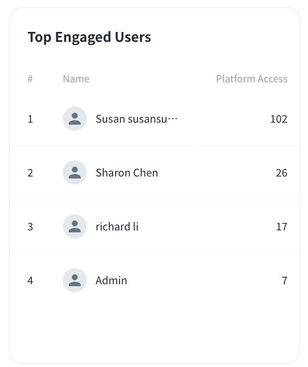 • Top Engaged Users: List the name and platform access count of the most engaged users. Click each user to access the user profile information.