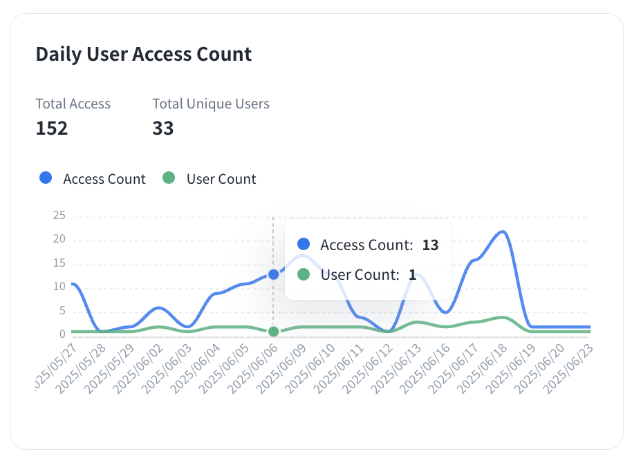 • Daily User Access Count: The list of daily users and access count. Hover over data points to get detailed information.