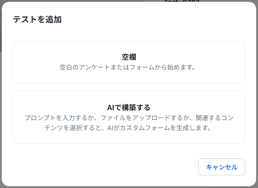 「AI生成」:AIが自動でテストを作成します。AI作成の手順は「AIで構築する」を選択した場合をご参照ください。