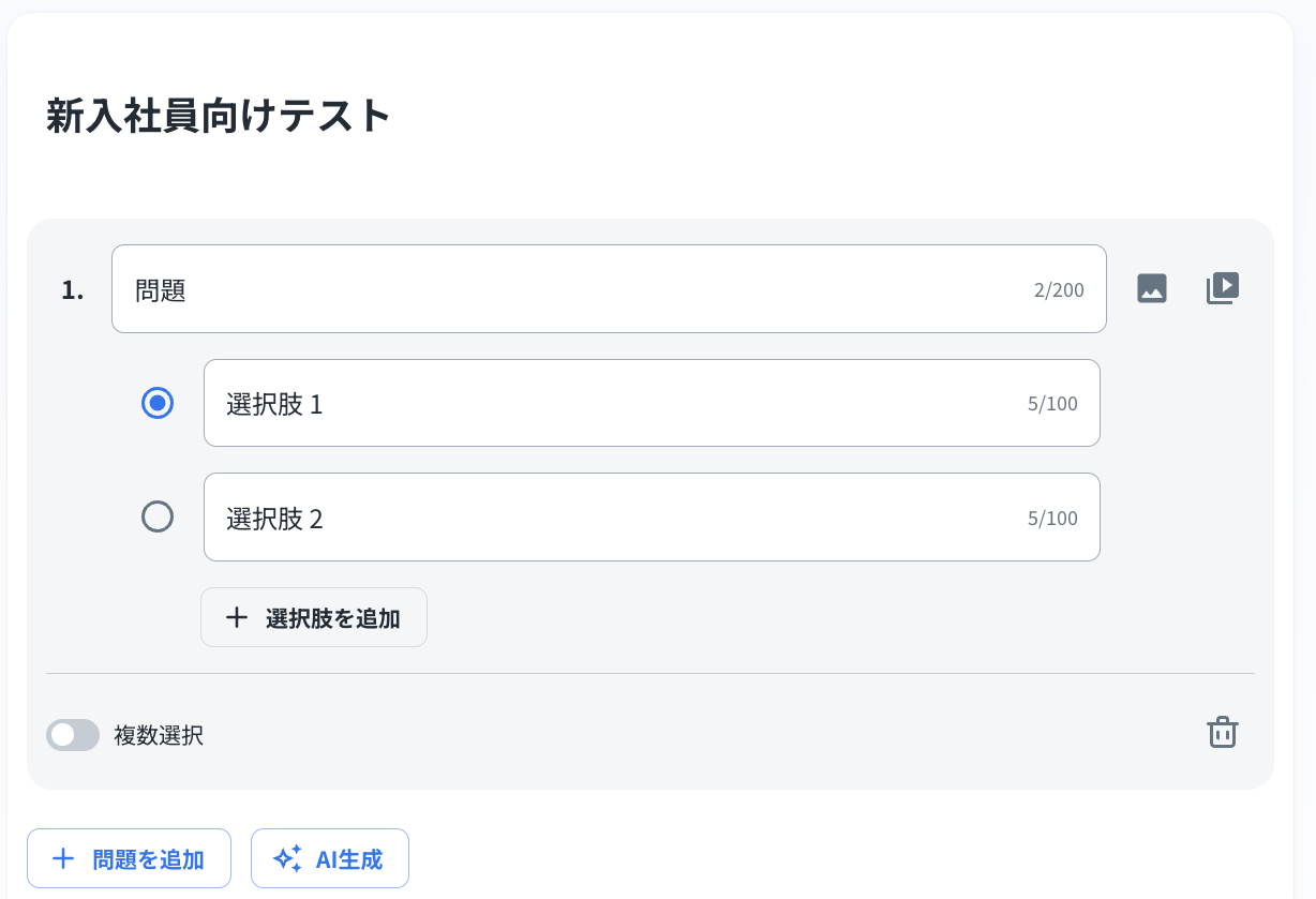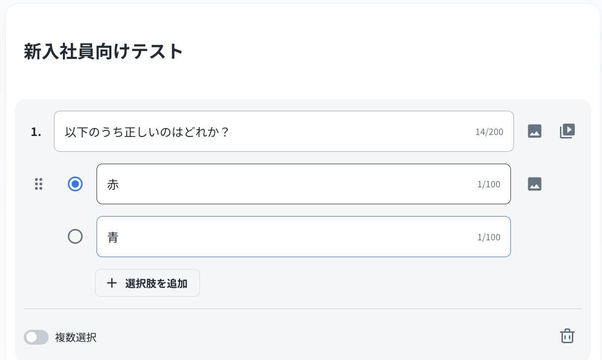 フォームタイプ:「単一回答」「複数選択」「真偽回答」から選択します。