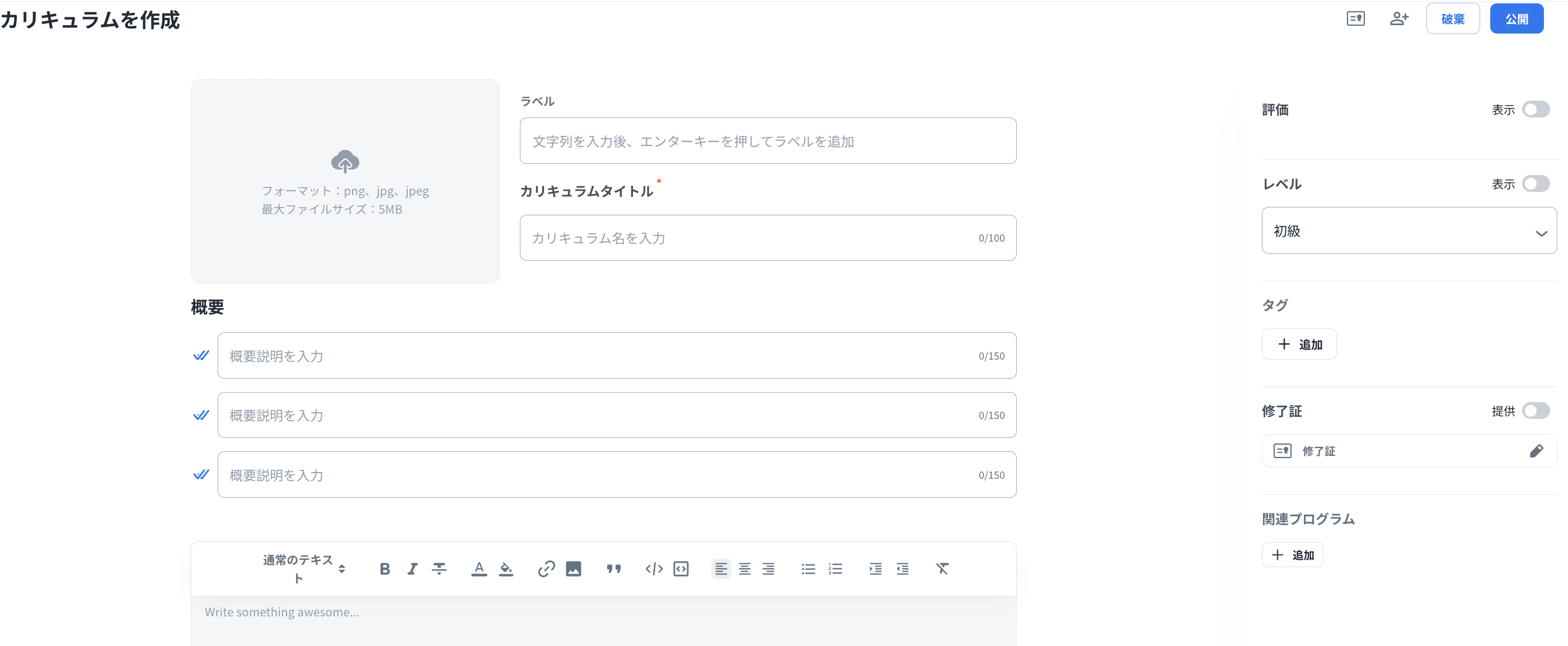 「概要」にはカリキュラムの説明や目的などを入力します。