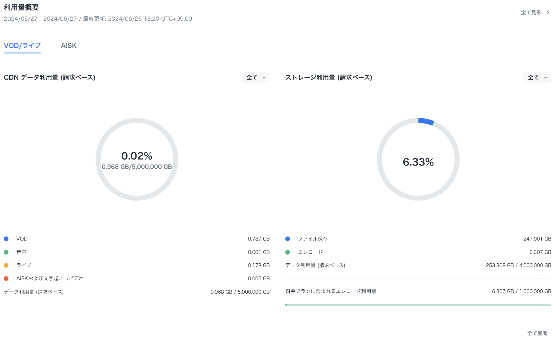 - 全て: ライブラリメニューにあるエンコードの際とエンコード済みの保存されているファイルの合計データ利用量を GBで表示しています。また、エンコード利用量もご確認いただけます。