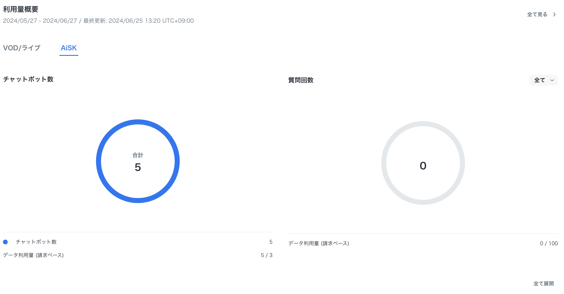 このセクションでは、CDNおよびストレージ使用量、AiSKのチャットボットおよび質問回数など、請求予定使用量の概要が各種グラフと共に表示されます。