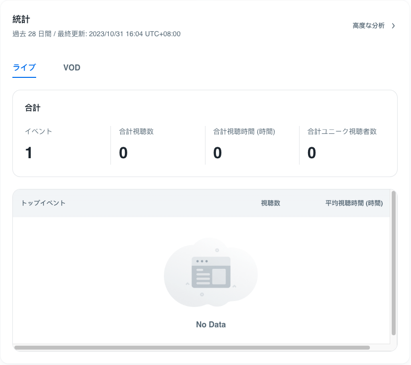 - イベント(ライブタブ)/ VOD(VODタブ):過去のライブイベント(アーカイブイベントを含む)およびVODの数が表示されます。