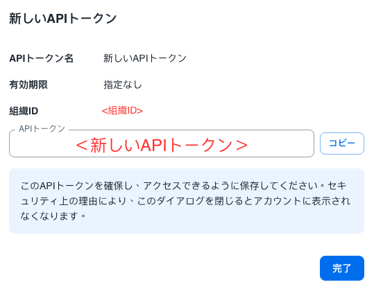 - セキュリティ上の理由から、「完了」ボタンを押してポップアップウィンドウを閉じると、以後、トークンの詳細は見ることができなくなります。