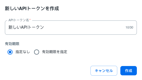 ご希望のAPIトークン名と有効期限を入力し、「作成」ボタンを押します。