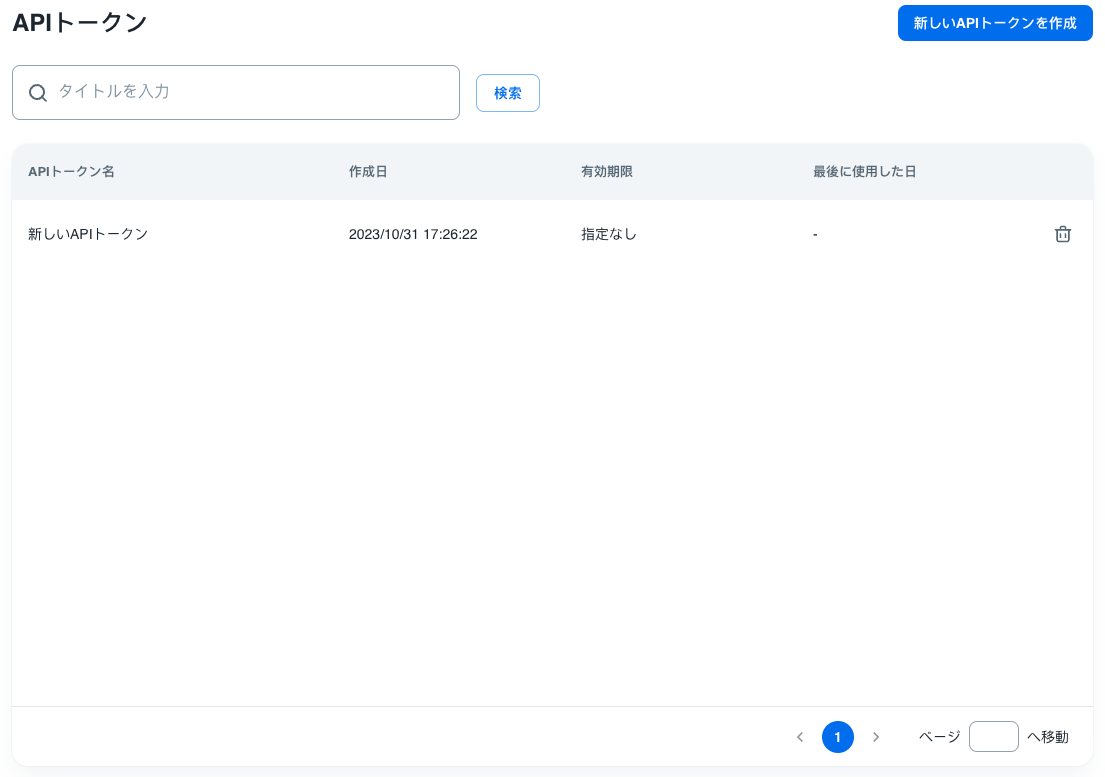 APIトークン一覧で削除したいAPIトークンの右側にある削除アイコンを押します。