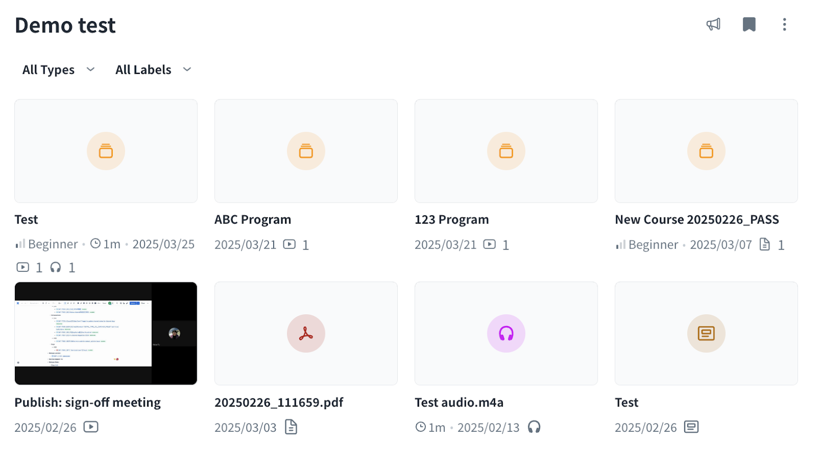 - Filter the content by Types or Labels from the drop-down menu, and click the thumbnail to go to the detailed page of the content.