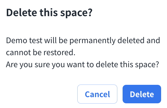 - Delete: Click Delete icon and “Delete” button to delete the space. Please note the action can not be undone.