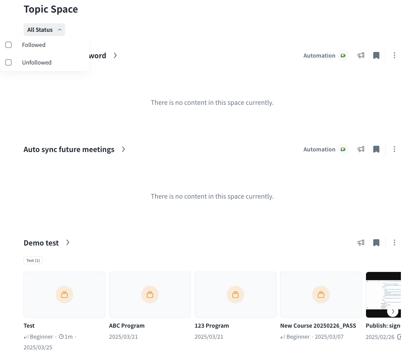 - Filter the spaces by Status (Followed/Unfollowed) from the drop-down menu.