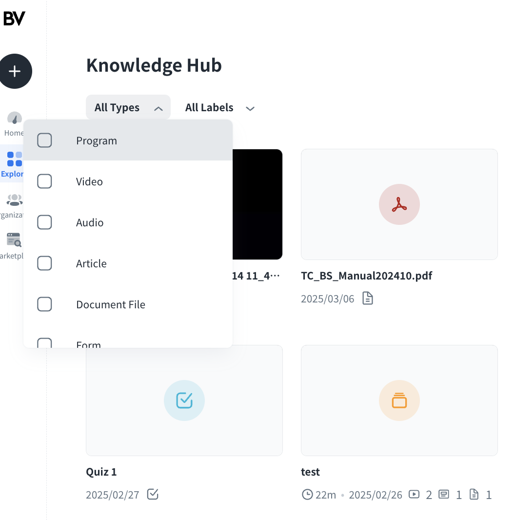 1. You can filter the content by Types or Labels from the drop-down menu, and click the thumbnail to go to the detailed page of the content.