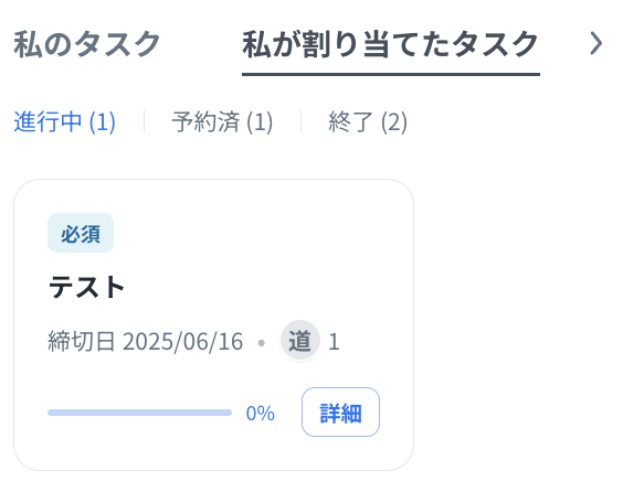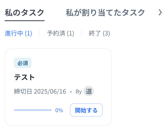自分に割り当てられたタスクを「進行中」「予約済み」「終了」の各ステータス毎に確認できます。