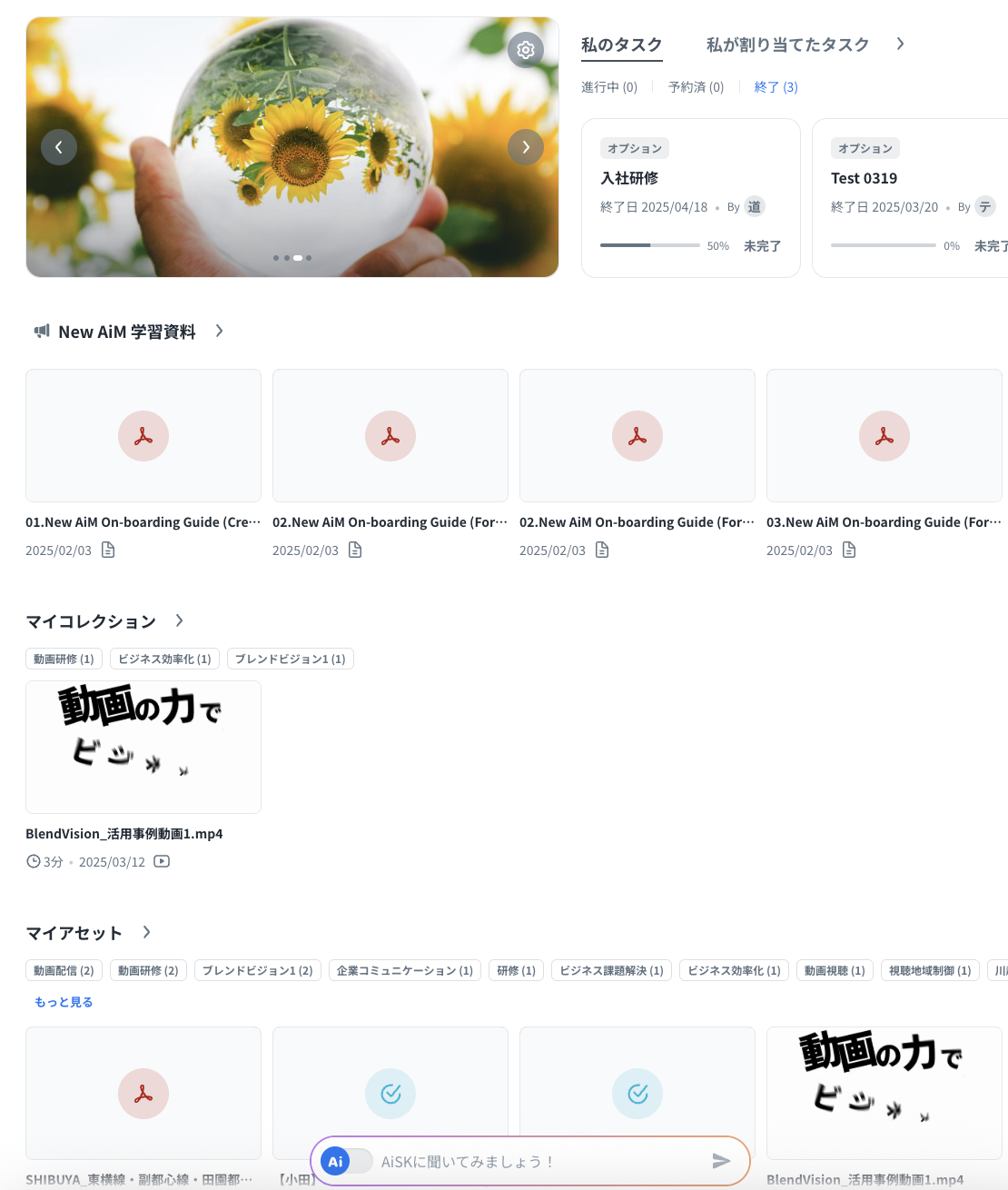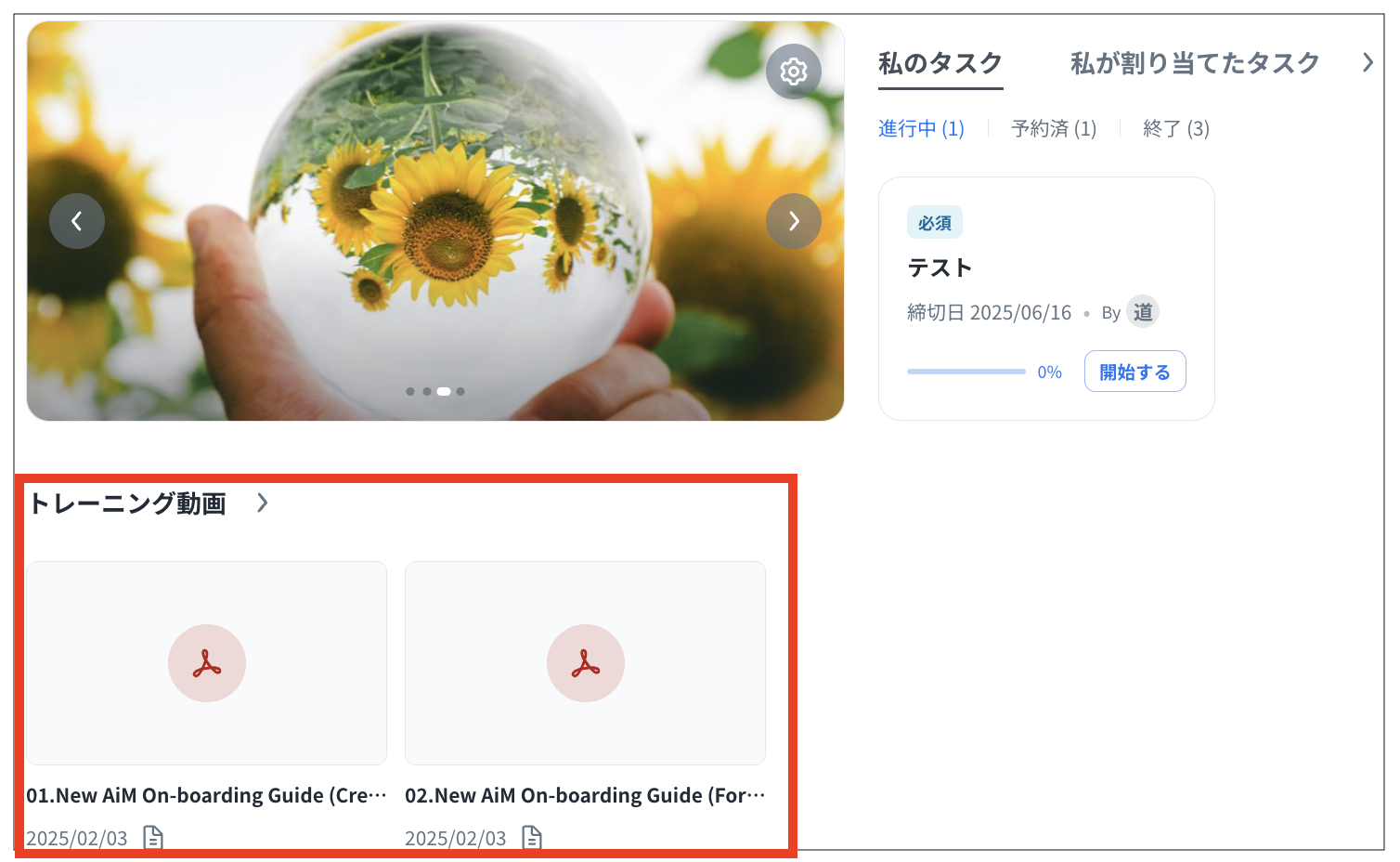 サイドメニューの「ホーム」では、バナーの設定、タスク、スペース、各種コンテンツなどをカスタマイズして表示できます。
