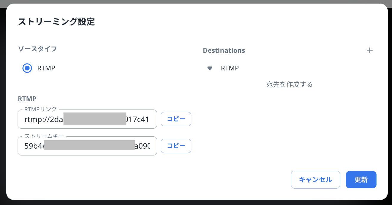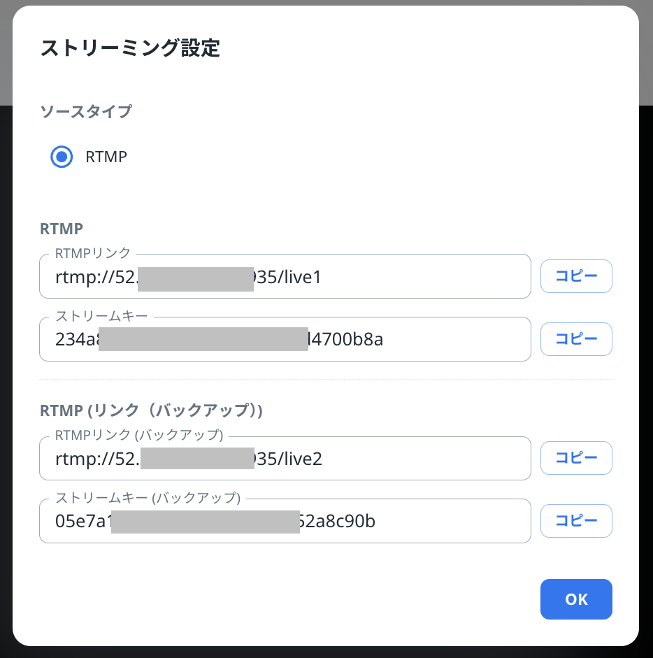 - ストリームキー:ライブ配信用のソフトウェアによっては、RTMPリンクとストリームキーをそれぞれ別々に入力する必要があります。