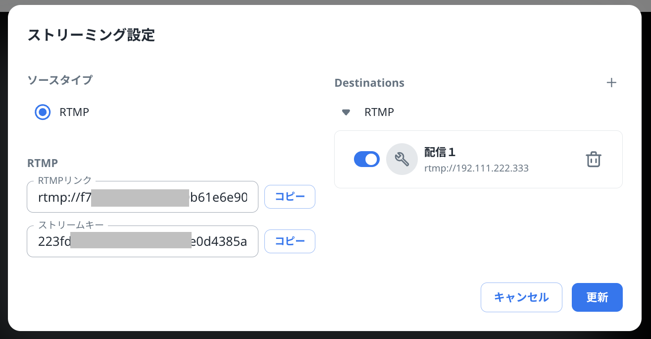 - RTMPリンク(メイン):ライブストリーミングのプライマリソースフィードとして機能します。