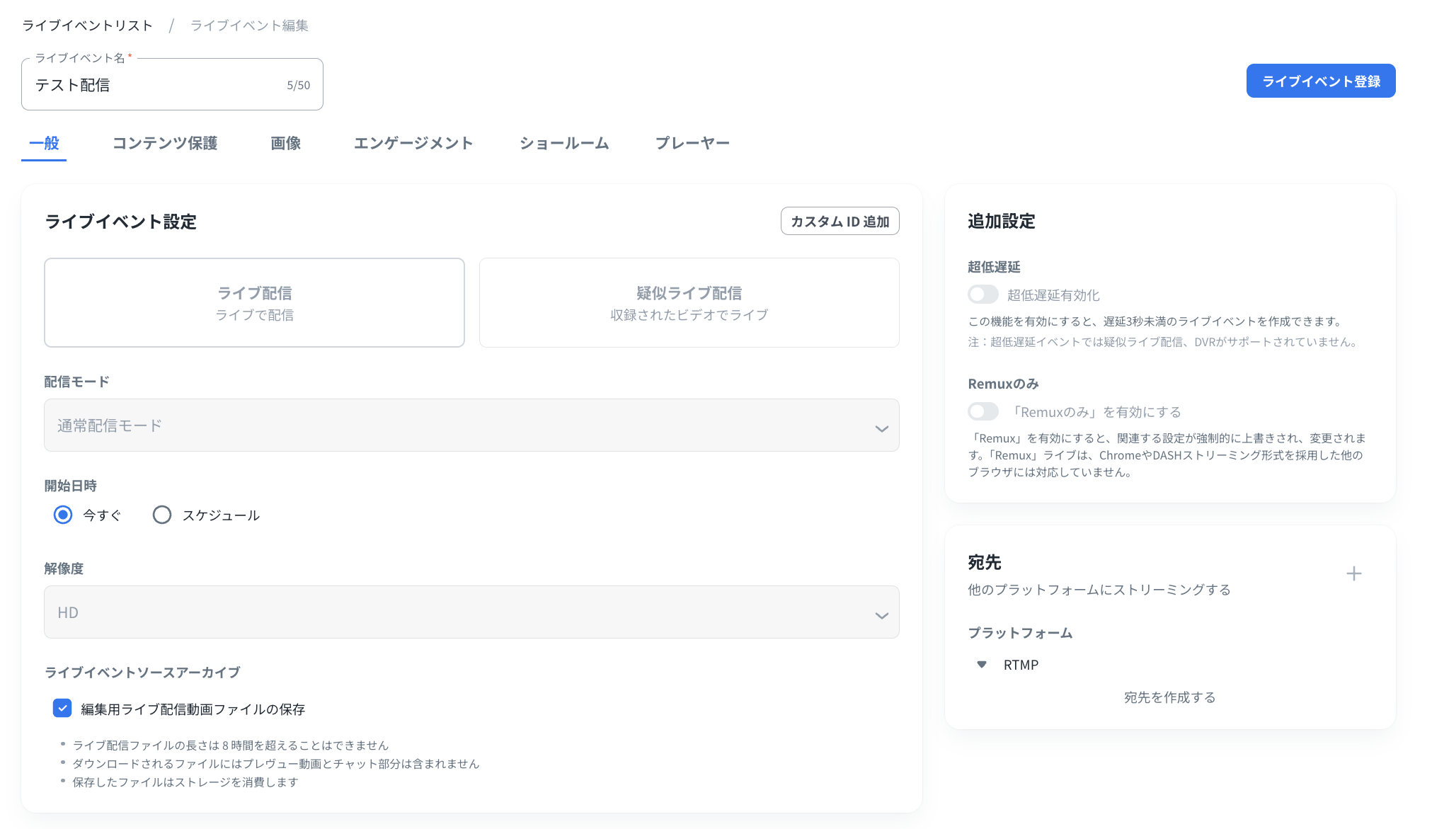 設定の編集が完了したら、設定ページの右上にある「ライブイベント登録」ボタンをクリックすると、同一のライブイベントに編集した内容が新たなライブとして上書き保存されます。