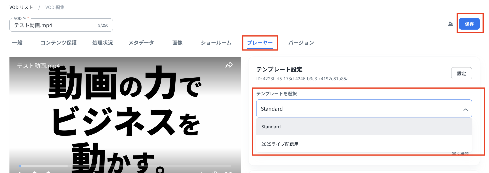 VOD/ライブイベント設定ページの「プレーヤー」タブに移動します。
