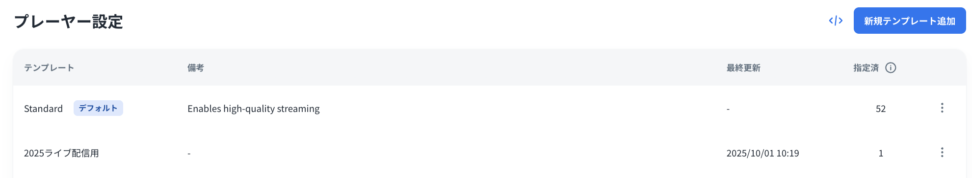 - 各テンプレートは、BlendVisionウェブコンソールのサイドメニュー「プレーヤー」>「設定」から確認できます。