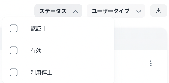 フィルター機能:「ステータス」や「ユーザータイプ」でフィルタリングできます。