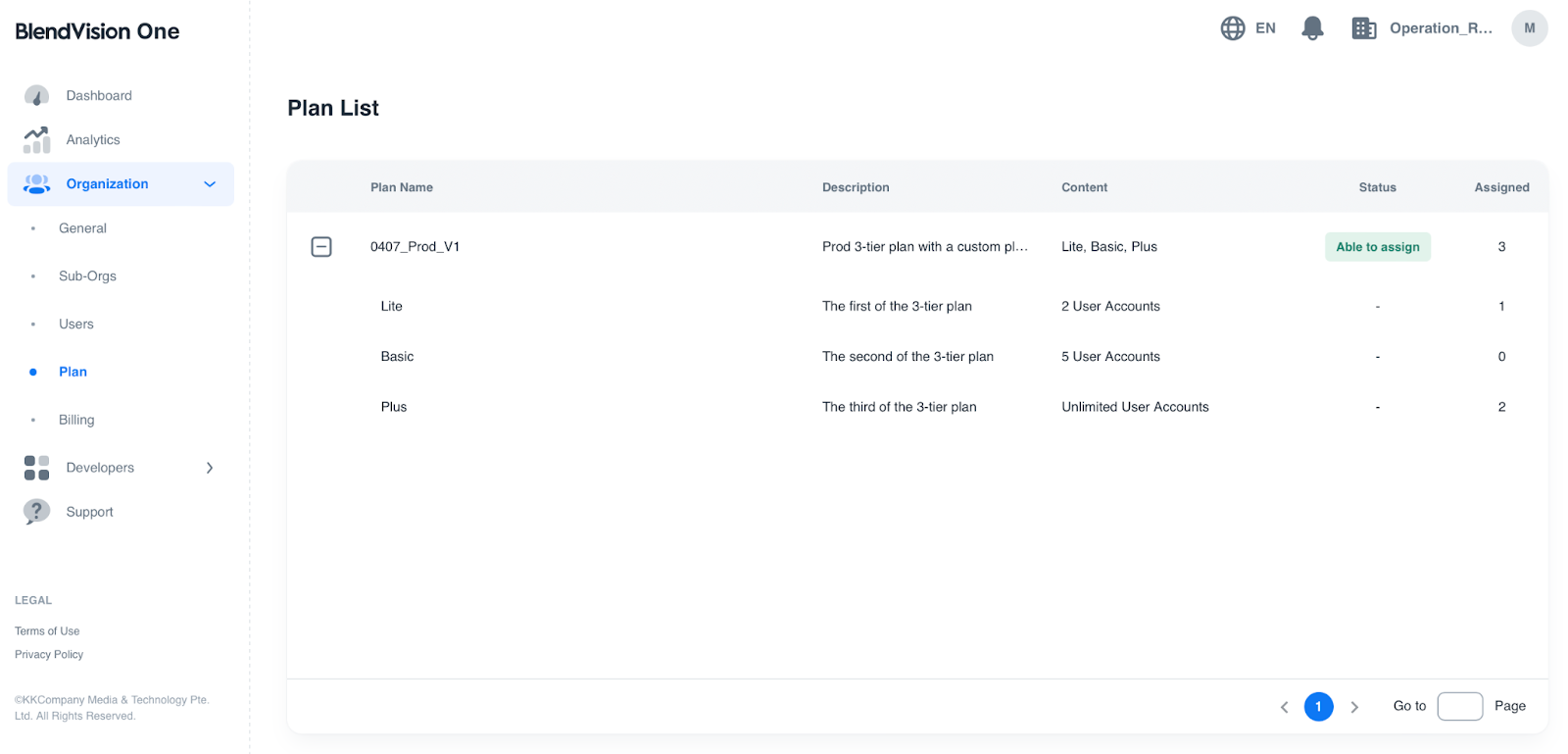 In the Plan page, you can confirm the assignable plans for the sub-organization under this reseller organization.