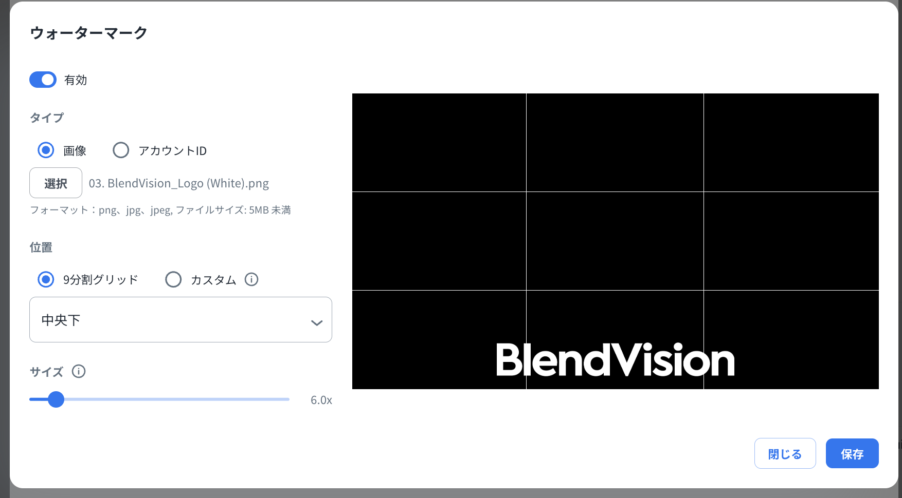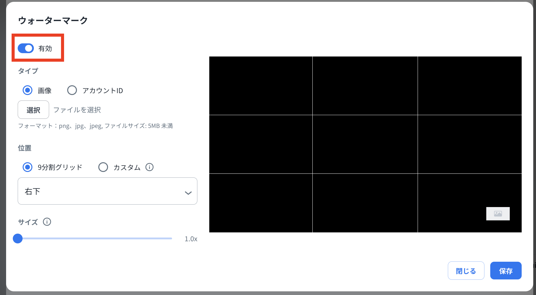 ウォーターマークを表示する「位置」と「サイズ」を設定します。