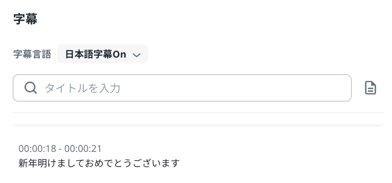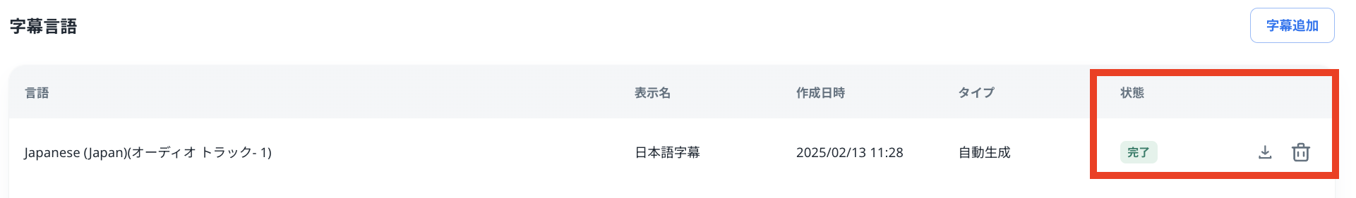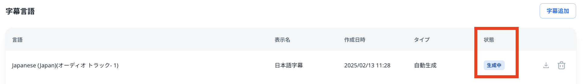 字幕の生成が完了すると「字幕」に字幕が表示され、「字幕言語」ではダウンロードと削除アイコンが有効化されます。