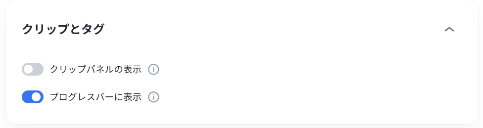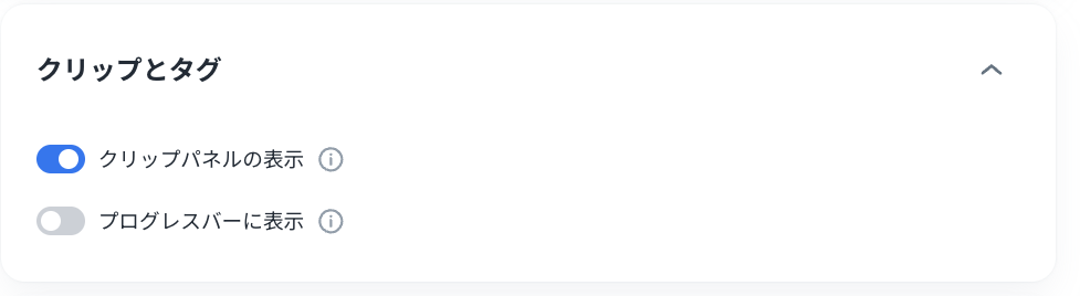 「クリップとタグ」の「クリップパネルの表示」を有効にして画面右上の「保存」ボタンをクリックして保存するとプレーヤー画面にクリップパネルのメニューが表示されます。