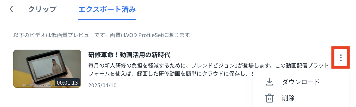 エクスポートしたクリップは「ダウンロード」および「削除」可能です。