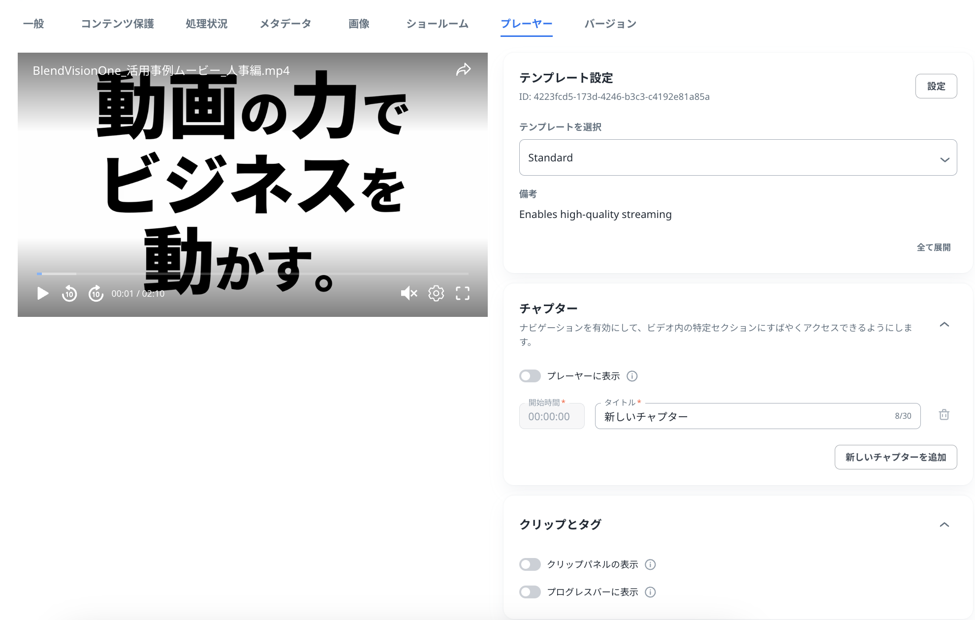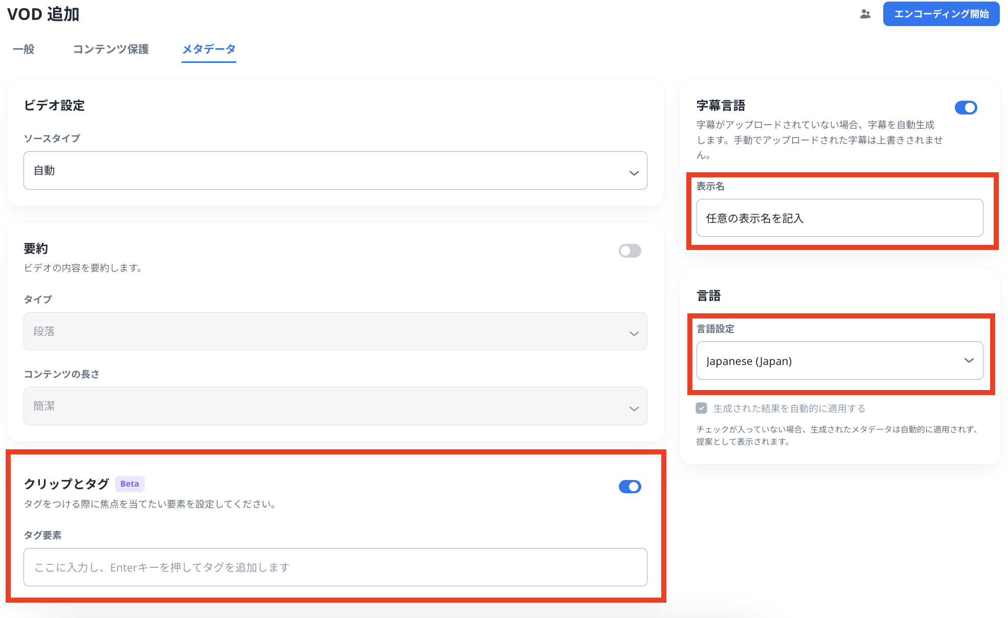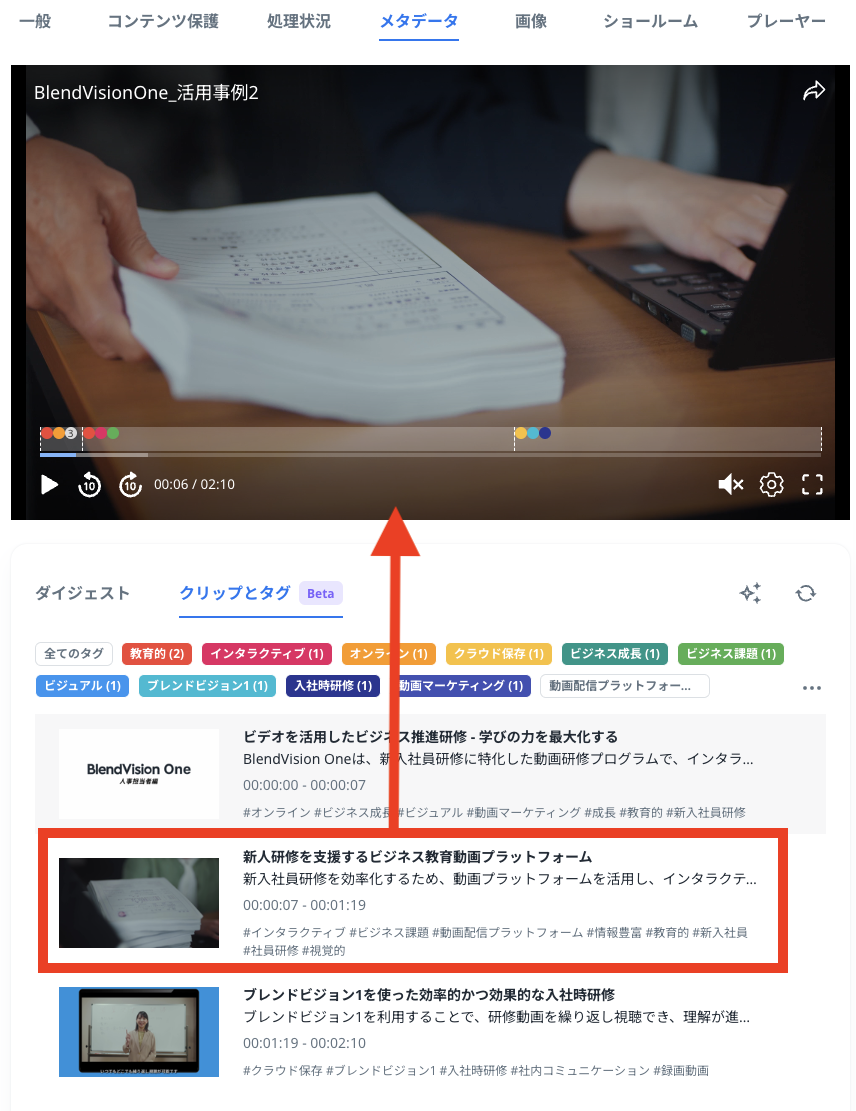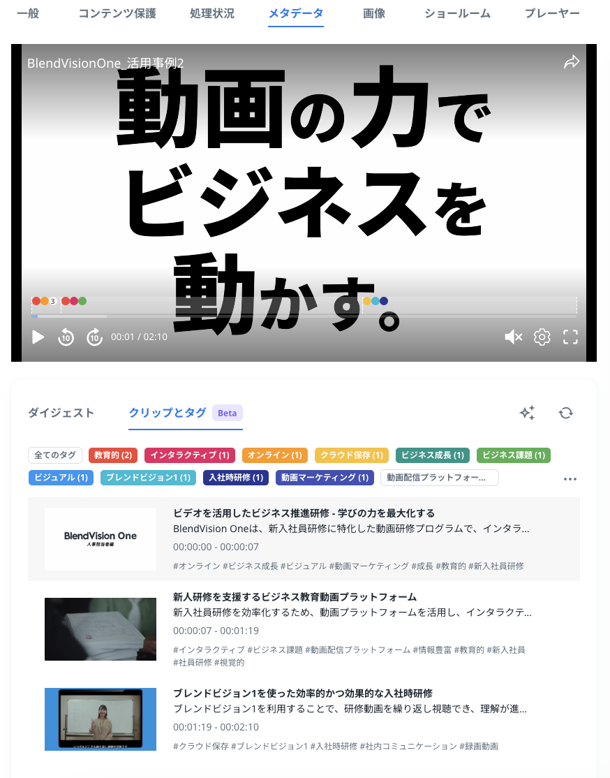 エンコード処理の完了後、対象のVODをクリックして「メタデータ」タブを開くと自動生成されたクリップとタグが確認できます。