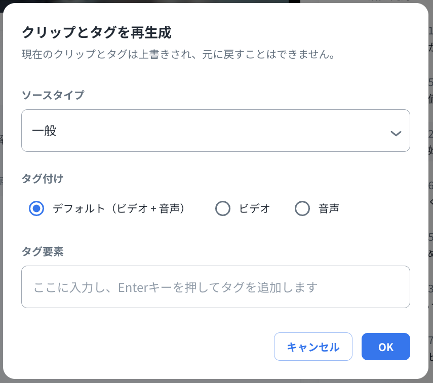 以下の手順で自動生成されたクリップとタグの再生成が可能です。
