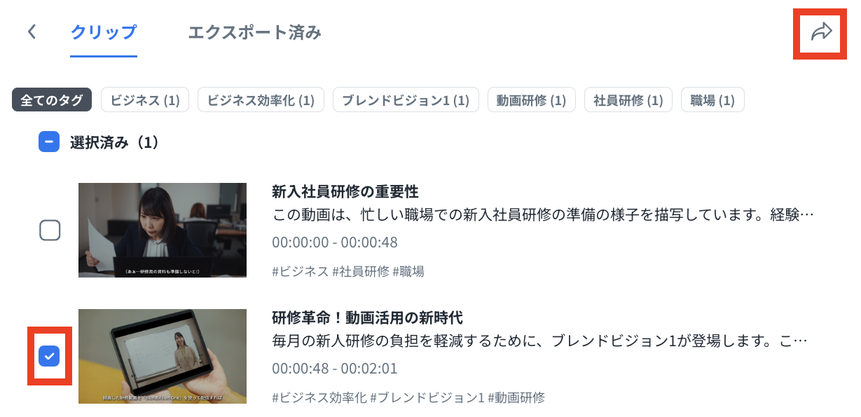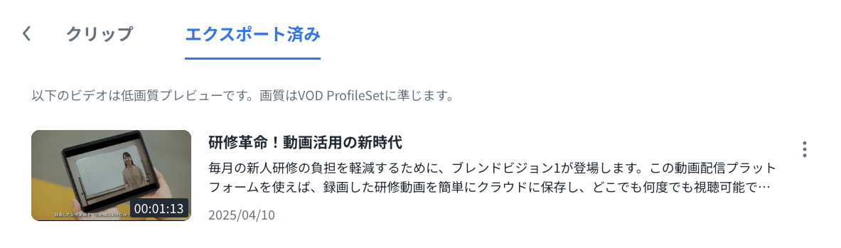 エクスポートしたクリップは「エクスポート済み」タブで確認できます。