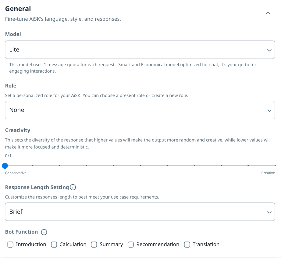 Click to expand/collapse the section (default: expanded) and define AiSK’s language, style, and responses.