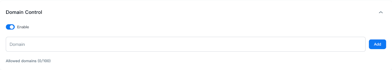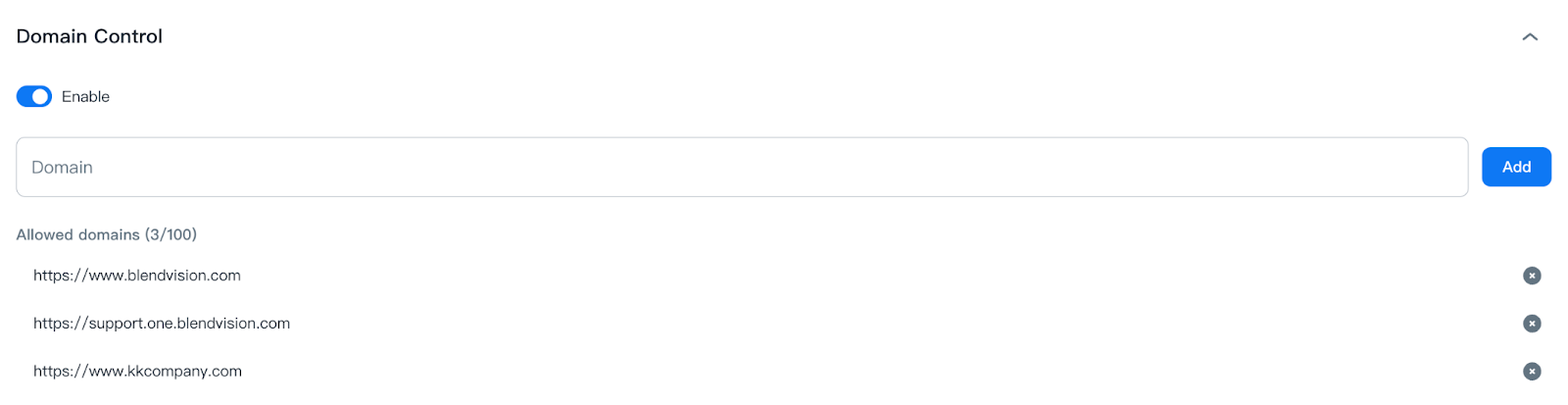 After enabling Domain Control, you can add domains up to the maximum 100 allowed domains.