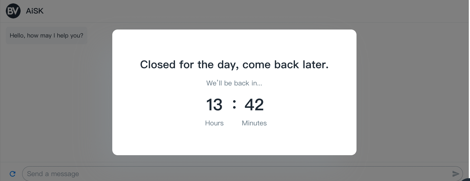 • Once the messages reach the limit, the countdown timer and reminder “Closed for the day, come back later” will be shown on the page. Countdown timer will be re-calculated if you reset the Daily Max value.