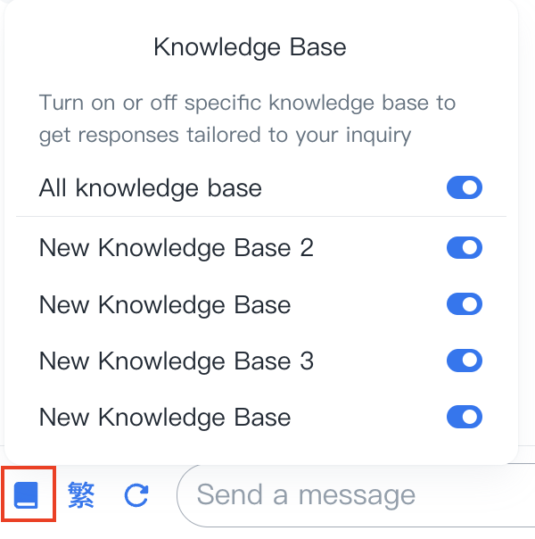 • Knowledge Base selection: When Knowledge Base toggle is turned on,  Knowledge Base selection will be available and the icon will be shown. The users can select specific Knowledge Bases or all Knowledge Bases here based on their requirements.