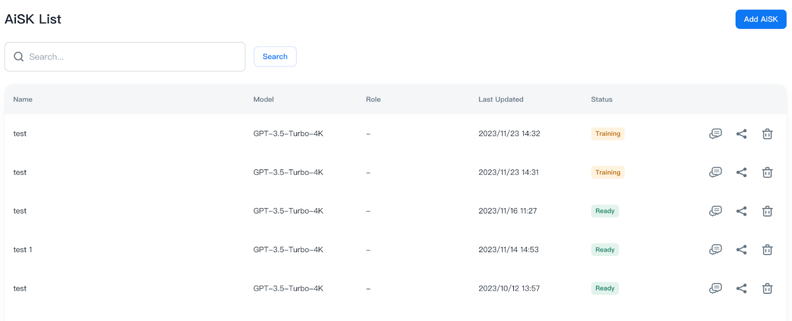 There are three statuses (Training/Ready/Failed) for AiSK, please find each status’ details in the table below.