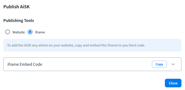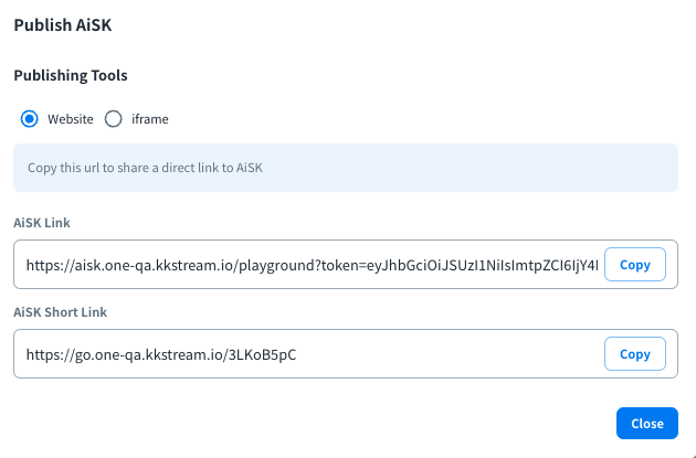 When your AiSK is ready, you can click the share icon on the AiSK list or Playground to share AiSK via website or iframe.