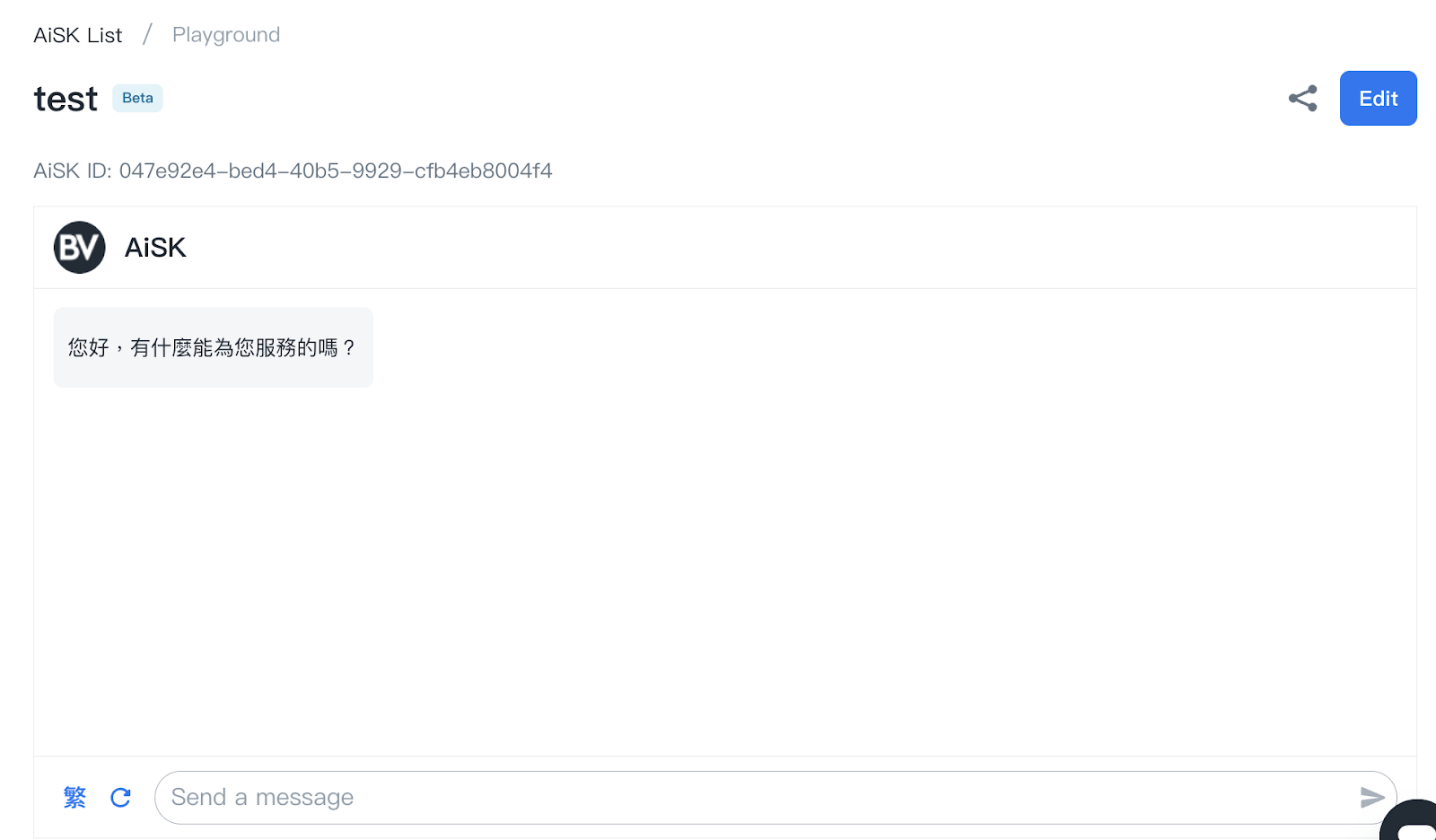 After all the information has been defined, click Create AiSK and will go to Playground where you can edit the AiSK and share the AiSK via the share button on the upper right side.