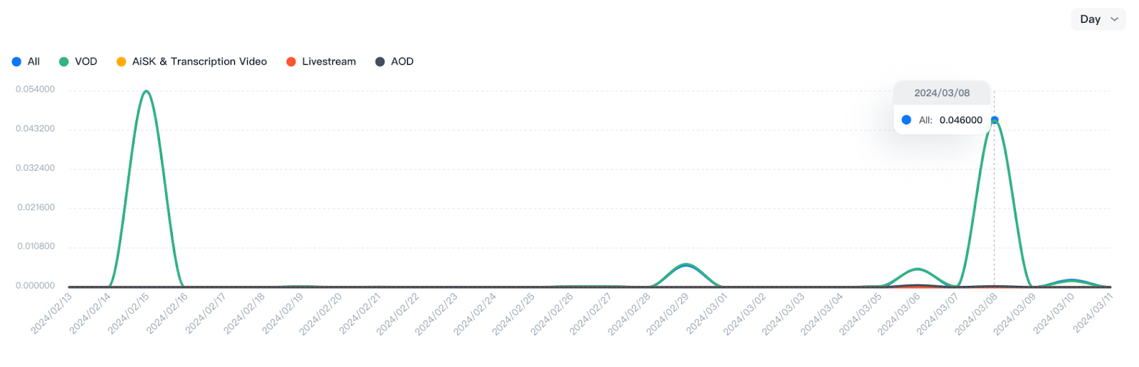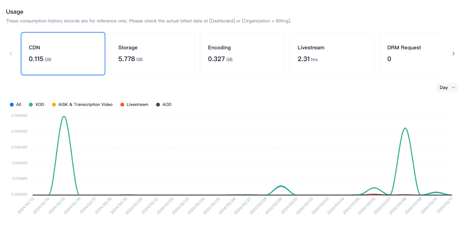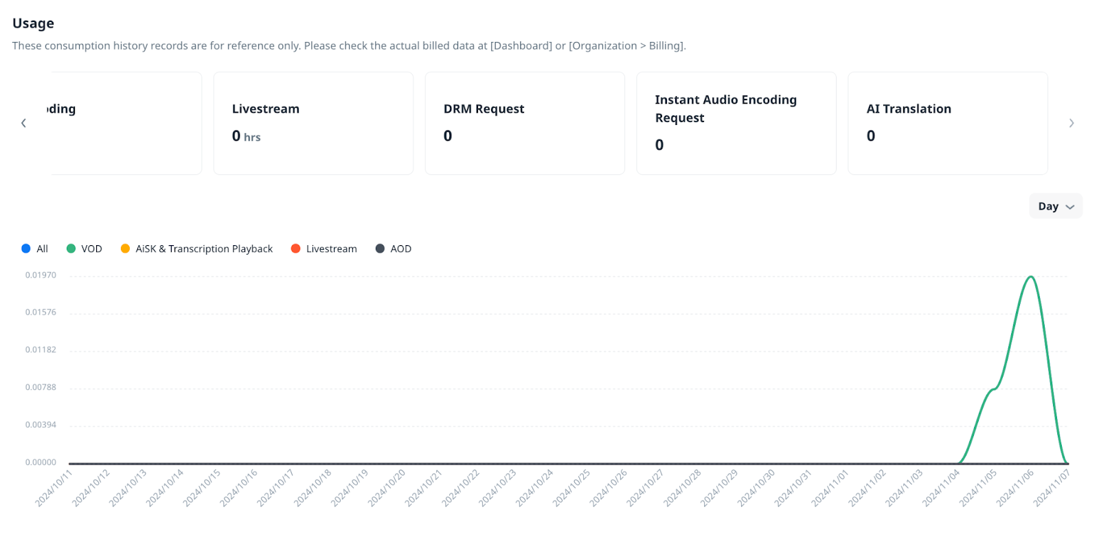 Note: Displayed records are for reference purposes only. For actual billed data, please check the Dashboard or in Organization > Billing.