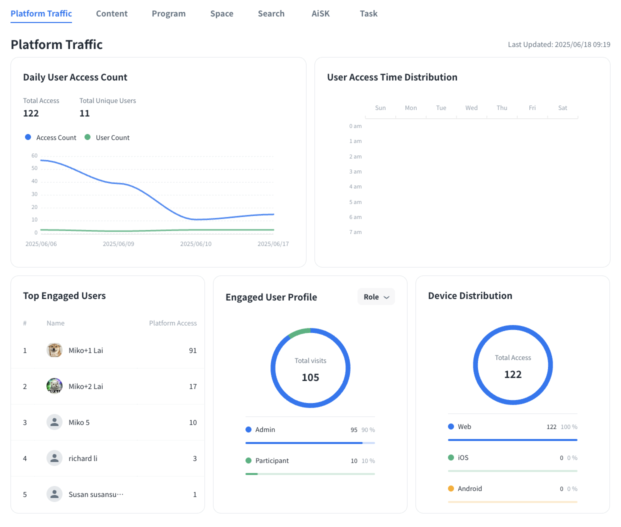 - Top Engaged Users: List the name and platform access count of the most engaged users. Click each user to access the user profile information.