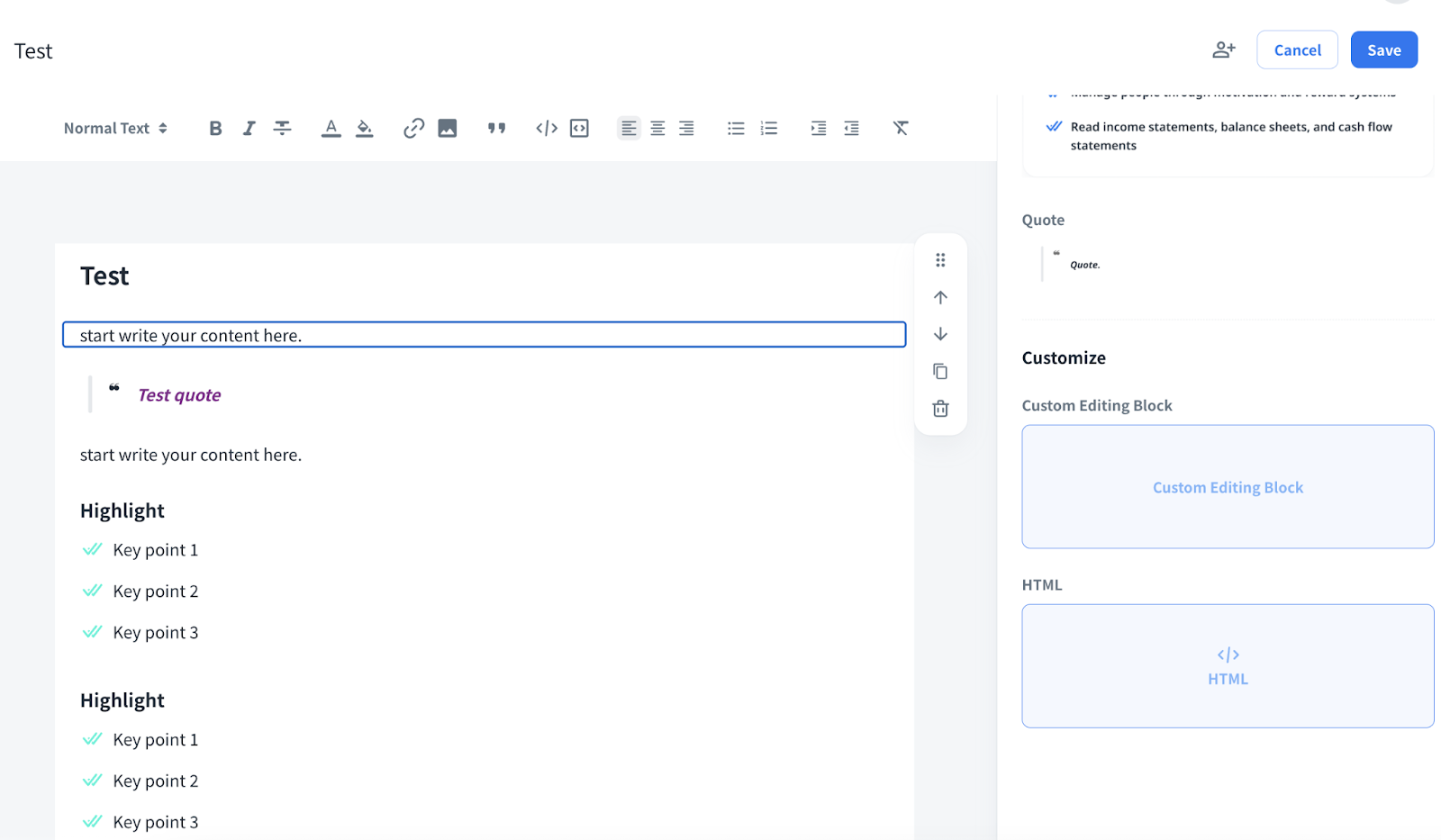 You can change the article title and the content, highlight, quote and customized information. After your editing is completed, click Save to save the changes or Cancel to discard.