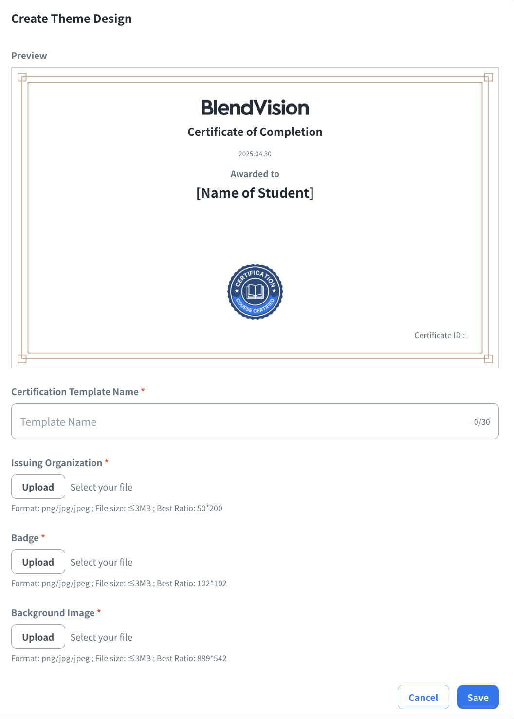 - Certification Template Name (Required): The name of your certificate (Max:30 characters)