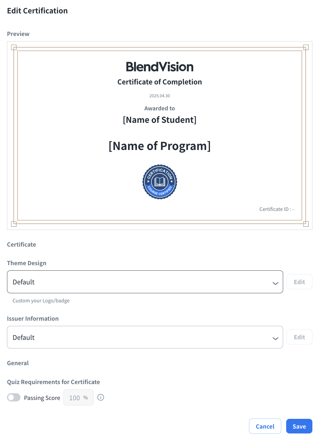 On BlendVision AiM service, you can establish the conditions for users to obtain a certificate for your program.