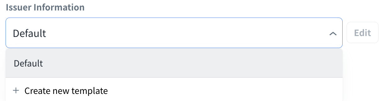 - Issuer Information: You can customize information of the issuer of the certificate. Select the template from Default, you created previously (and edit it) or click “+ Create new template” to create a new one.